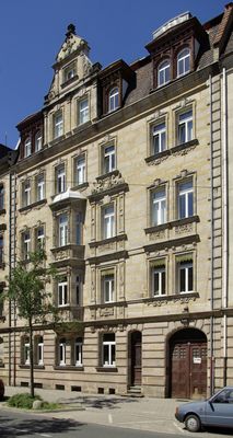 Mietshaus, viergeschossiger Mansarddachbau mit reich gegliederter Sandsteinfassade, rustiziertem Erdgeschoss, Erker, Schnitzgauben und hohem Zwerchhausgiebel, im Neu-Nürnberger-Stil, von Gustav Hübler, bez. 1903;