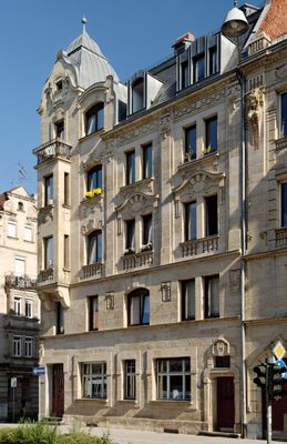 Mietshaus in Ecklage, viergeschossiger Mansarddachbau mit reich gegliederter Sandsteinfassade, beiderseits mit Erkern mit Eisenbalkonbrüstung und Eckturmaufsatz, barockisierender Jugendstil, Sandstein, von Bräutigam und Wiessner, 1906/07.