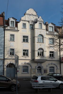 Mietshaus, dreigeschossiger traufständiger Satteldachbau mit geschweiftem Giebel und leicht vorspringendem Erker, Jugendstil mit Renaissanceformen, wohl von Johannes Kronfuß, 1904