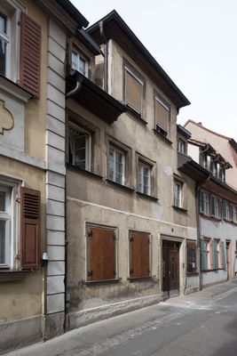 Doppelhaus, linke Hälfte, zweigeschossiger Traufseitbau mit schlichter Straßenfront, Erdgeschoss massiv, Obergeschoss verputztes Fachwerk, um 1450/80, rückwärtig zweigeschossiger Anbau von 1893, hofseitig Seitenflügel mit Laubengang 16./17. Jahrhundert und Rückgebäude f