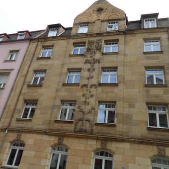 Mietshaus, viergeschossiger Mansarddachbau mit Schopf, Sandsteinzwerchgiebel und Dachgauben, Backsteinbau mit Sandsteinstraßenfassade, reicher Jugendstildekor mit reliefiertem Baum, um 1905/08