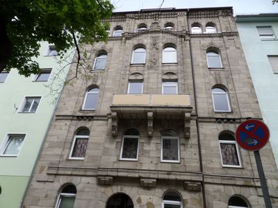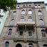 Mietshaus, fünfgeschossiger, traufständiger Satteldachbau mit Dachgaube, Sandsteinstraßenfassade, sehr flachem, dreigeschossigem Erker und Eisenbalkon, expressiver Spätjugendstildekor mit Figurenrelief, um 1908/09