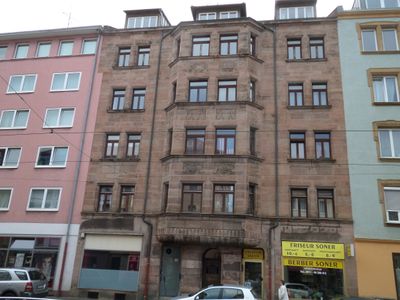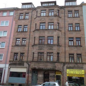 Mietshaus, fünfgeschossiger, traufständiger Satteldachbau mit Sandsteinstraßenfassade und breitem Erker mit abgeschrägten Ecken, Jugendstil, bezeichnet „1907“