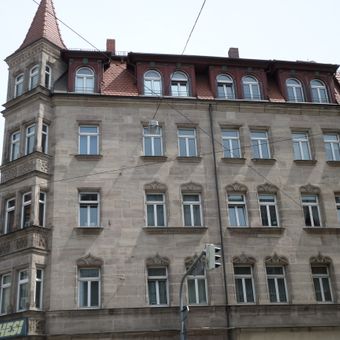 Mietshaus in Ecklage, viergeschossiger Mansarddachbau mit Sandsteinstraßenfassade, Dacherkern und viergeschossigem Sandsteineckerker mit Spitzhelm, Neu-Nürnberger-Stil mit neugotischen Formen, um 1895/1900