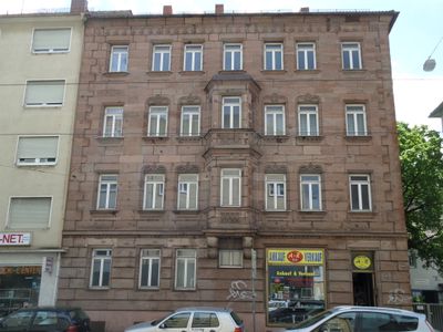 Mietshaus, viergeschossiger Walmdachbau mit Sandsteinstraßenfassade und zweigeschossigem, einachsigem Sandsteinerker, reiche Neugotik, um 1900