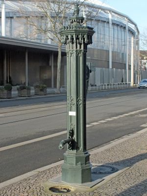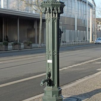Handschwengelpumpe Pfaffendorfer Straße, Handschwengelpumpe mit Brunnenschacht und Abdeckplatte in Ecklage Erich-Weinert-Straße (Typ Gotik)