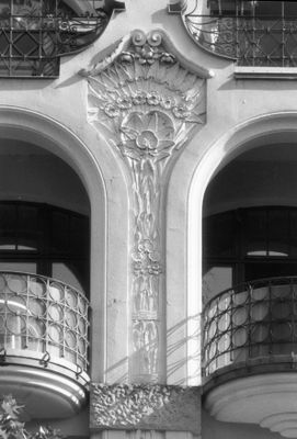 Doppelmietshaus Nordplatz 10, Doppelmietshaus in offener Bebauung in Ecklage Balzacstraße 1 mit Hofgebäude und hölzerner Gartenpavillon (Putzfassade; bleiverglaste Treppenhausfenster; Schablonenmalerei im Art Déco)