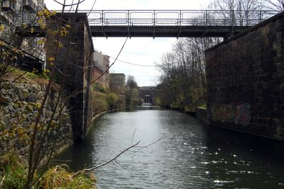 Aurelienbrücke, Brückenpfeiler der ehemaligen Straßenbrücke über den Karl-Heine-Kanal, inzwischen Fußgängerbrücke