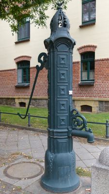 Handschwengelpumpe Lobstädter Straße, Handschwengelpumpe mit Brunnenschacht und Abdeckplatte vor Nr. 9 und in Ecklage Ernst-Toller-Straße (Typ Vogelkäfig)