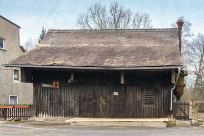 Speicher an Wassermühle Pomßen, Speicherbau einer Mühle, alte Ortslage Kleinpomßen, Getreidespeicher der Wassermühle, verbretterte Fachwerkbau, ortsgeschichtliche und baugeschichtliche Bedeutung