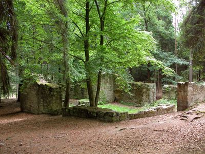 Die Steinstruktur zeigt verbliebene Mauern mit gotischen Fenstern und steht nahe einer natürlichen Quelle namens Antoniusbrunnen im Dippoldiswalder Heide.