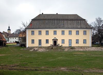 Herrenhaus (Nr. 10) und Wirtschaftsgebäude (Nr. 5, mit Pferdestall) eines ehemaligen Rittergutes sowie Reste des Gutsparks Zum Rittergut 5 10