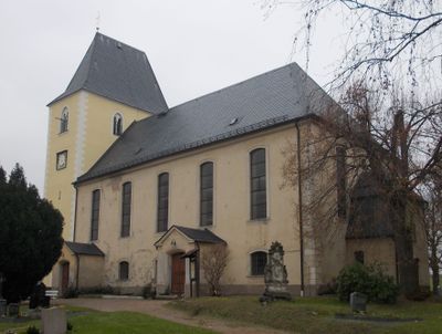 Kirche (mit Ausstattung) sowie Treppe vor dem Kirchturm und Platz mit Pflasterung Kirchplatz -