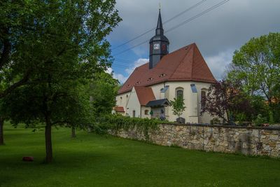 Einzeldenkmale der o. g. Sachgesamtheit: Kirche mit Einfriedung, Kriegerdenkmal des Zweiten Weltkrieges, Epitaph an der Kirchenwand sowie Familiengrab Sparmann Am Oberen Bach -, bau- und ortsgeschichtliche Bedeutung Evangelische Pfarrkirche, ehem. Kreuzkirche. Langgestreckte Saalkirche romanischen Ursprungs, Umbau 1609/10, Restaurierungen 1889, 1921–23, 1947–49 und 1952/53, 1994 Grabungen. Verputzter Bruchsteinbau mit st