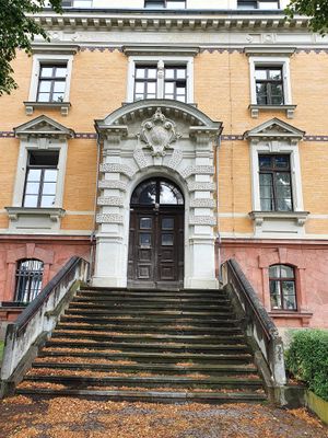 Wilhelm-Pieck-Straße 6; 6a, Bad Lausick, Ehemaliges Gerichtsgebäude (Nr. 6) mit Vorgarten, Resten der Einfriedung, Hofpflasterung, Wohnhaus (Nr. 6a, vermutlich ehemals Gefängnis) und kleines Nebengebäude im Hof - repräsentativer Klinkerbau im Stil der Neorenaissance