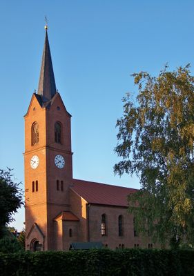 Kirche mit Ausstattung, Kirchhof und Einfriedung Hauptstraße -, neoromanischer Ziegelbau mit gerade geschlossenem Chor, Apsis und Westturm, baugeschichtlich und ortsgeschichtlich von Bedeutung neuromanische Saalkirche mit gerade geschlossenem Chor und Apsis, Westturm mit Haube (1972 verändert), Backsteinbau auf