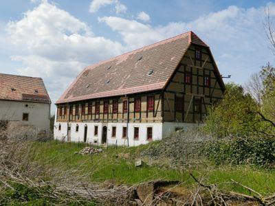 Wohnstallhaus eines ehemaligen Vierseithofes Mettelwitz 1, Obergeschoss Fachwerk, zeit- und landschaftstypisches Bauernhaus der Lommatzscher Pflege, baugeschichtlich von Bedeutung Krüppelwalmdach, Sandstein-Türstock