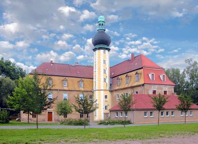 Einzeldenkmal der Sachgesamtheit Rittergut Hof: Neues Schloss Am Dorfplatz 2, stattlicher Putzbau über winkligem Grundriss, im Winkel hoch aufragender Treppenturm mit Zwiebelhaube und Laterne, baugeschichtlich und ortsgeschichtlich von Bedeutung zweiflügeliger, zweigeschossiger Putzbau mit Mansarddach, hakenförmiger Grundri