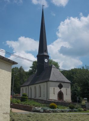 Kirche mit Ausstattung sowie Kirchhofsumfriedung und Kriegerdenkmal für Gefallene des 1. Weltkrieges Waldenburger Straße -, baugeschichtlich und ortsgeschichtlich von Bedeutung, schlichte Saalkirche, im Kern romanisch, spätgotisches Westportal, dreiseitiger Ostschluss, erneuertes spätgotisches Westportal, Ausstattung: Altarkruzifix und zwei Schnitzfiguren, Kriegerdenkma