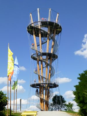Der Schönbuchturm erhebt sich 35 Meter hoch auf dem Stellberg, mit drei Aussichtsplattformen, verbunden durch Wendeltreppen mit 174 Stufen.