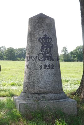Meilenstein, Vollmeilenstein der Altona-Kieler Chaussee. Entfernungsangabe Südseite: Altona 4 M(eilen = ca. 30 km) Nordseite: Kiel 8¼ M(eilen = ca. 62 km). Auf der Vorderseite erhabenes Königsmonogramm [[Friedrich VI. (Dänemark und Nor