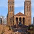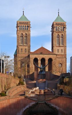 Die Sankt Pirminius Kirche weist eine Doppelturmfassade mit neugotischem Backsteindesign auf und erreicht eine Höhe von 52 Metern.