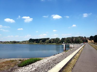 Talsperrendamm des Döllnitz-Stausees, Blick von der Staumauer in Richtung Wermsdorf