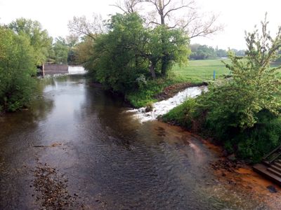 Flusswehr an der Weißen Elster in der Nähe von Bornitz, Flusswehr an der Weißen Elster bei Bornitz von der Holzbrücke mit Bootsanleger