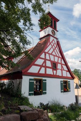 Hirtenhaus, Ehem. Hirtenhaus, erdgeschossiger, traufseitiger Satteldachbau mit Fachwerkgiebel und Uhrendachreiter, 1835, Dachreiter 1920.