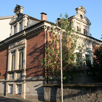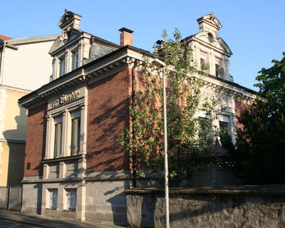 Baudenkmal D-4-63-000-5 in Coburg im Ortsteil Coburg, Villa, eingeschossig mit Zwerchgiebelrisaliten, Ziegel und Sandsteingliederungen, von Bernhard Kleemann, 1872, Fachwerkrückgebäude, 1911.