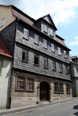 Baudenkmal D-4-63-000-496 in Coburg im Ortsteil Coburg, Wohn- und Geschäftshaus, dreigeschossiges traufseitiges Mansarddachhaus mit Fachwerkobergeschossen, Erdgeschoß barockisierend, Obergeschosse verschiefert in deutscher Schablone, Zwerchhaus, bez. 1739.