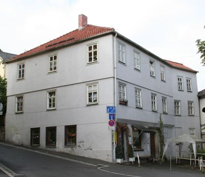 Baudenkmal D-4-63-000-494 in Coburg im Ortsteil Coburg, Wohn- und Geschäftshaus, dreigeschossiges Walmdacheckgebäude mit Fachwerkobergeschossen, 17. Jh., Haustür 1. Hälfte 19. Jh.