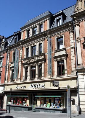Baudenkmal D-4-63-000-355 in Coburg im Ortsteil Coburg, Wohn- und Geschäftshaus, dreigeschossiger Mansarddachbau, Ziegelmauerwerk mit Sandsteingliederung, mit genuteter Pilasterordnung, Zwerchhaus mit Mansardwalmdach, manieristischer Historismus, von Martin Renner, 1893, Erdgeschoss modern umgebaut.
