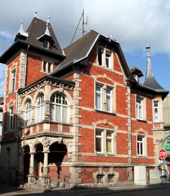 Baudenkmal D-4-63-000-344 in Coburg im Ortsteil Coburg, Villa, zweigeschossiger Walmdachbau in Ecklage, Ziegelmauerwerk mit Sandsteingliederung, mit Halbwalmrisaliten, Eckerker mit konkaver Spitzhaube und Walmdachturm, Neurenaissance, von Hans Rothbart, 1887.