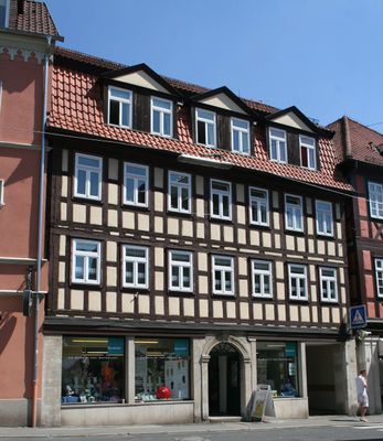 Baudenkmal D-4-63-000-214 in Coburg im Ortsteil Coburg, Wohn- und Geschäftshaus, dreigeschossiges, traufständiges Mansarddachgebäude mit Fachwerkobergeschossen, Portal bez. 1786.