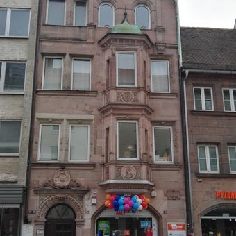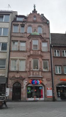 Baudenkmal D-5-64-000-247 in Nürnberg im Ortsteil Nürnberg-Lorenz, Wohn- und Geschäftshaus, viergeschossiger Sandsteinbau mit Sattedlach, reicher Fassadenschmuck mit Motiven aus Gotik, Neurenaissance und Barock, Relieftondo mit Bildnis des Johann Georg Goll, 1901.