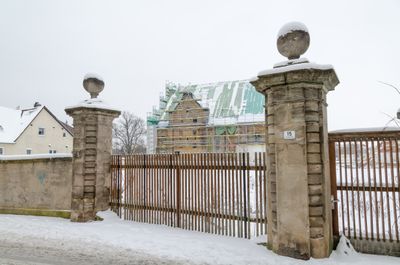 Einfriedung Fischstraße 15 in Ansbach, Steinmauer und Einfahrt mit kugelbekrönten Sandsteinpfeilern, 18. Jh.