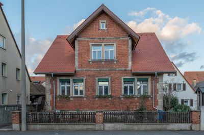 Baudenkmal D-5-62-000-1467 in Erlangen im Ortsteil Eltersdorf, Wohnhaus, eingeschossiger, traufseitiger Sichtziegelbau mit Satteldach, Sandsteingliederung und Zwerchhaus mit Satteldach, rückwärtig angebaut Nebengebäude, eingeschossiger Ziegelsteinbau mit Fachwerkkniestock und Frackdach, um 1880.