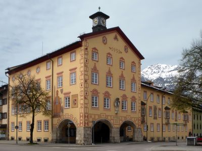 Baudenkmal D-1-80-117-206 in Garmisch-Partenkirchen im Ortsteil Partenkirchen, Rathaus, drei- bzw. viergeschossige mehrtraktige Anlage mit Flachsatteldächern in Formen des alpenländischen Heimatstils mit offener Erdgeschosshalle, Dachreiter, Dreieckerkern und Fassadenmalereien, von Oswald E. Bieber, bez. 1935, Malereien von J