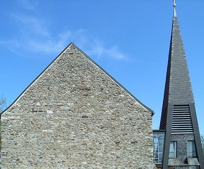 Baudenkmal D-2-76-148-51 in Zwiesel im Ortsteil Rabenstein, Kath. Filialkirche St. Johannes Nepomuk, Saalkirche mit Steildach über rechteckigem Grundriss, Langhaus Teil des ehem. Schlossstadels, Bruchstein, 1767, Umbau zur Kirche mit Verbindungbau und spitzem Glockenturm nach Süden 1964-66, von Ludwig Oster
