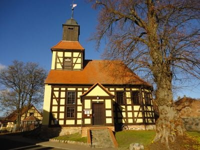 Die Dorfkirche zeigt Fachwerkbauweise mit einem westlichen Turm und polygonalem Chorschluss, ein Beispiel protestantischer Architektur des 18. Jahrhunderts.