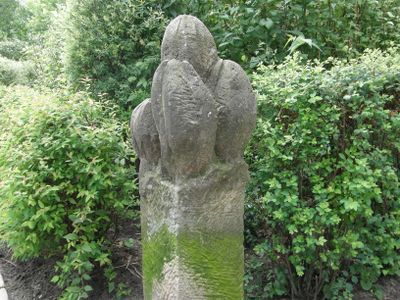 Hauseingangszeichen, Skulpturenensemble von Marguérite Blume-Cardenàs in der Zossener Straße in Berlin-Hellersdorf, bestehnd aus vier Einzelskulpturen