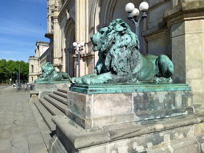 Zwei Löwen, Löwenstatuen am Eingang zum Welfenschloss (Hauptgebäude der Uni) in Hannover
