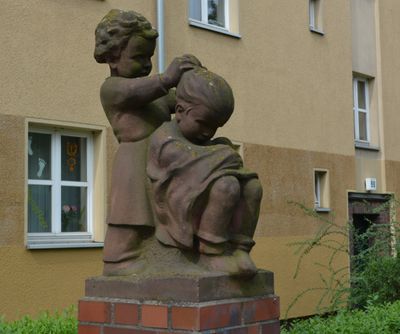 Zwei frisierende Mädchen, Skulptur von Arthur Wellmann im Berliner Ortsteil Plänterwald