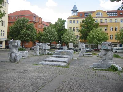 Wasserstein, Skulpturengruppe mit Brunnen von Makoto Fujiwara und Peter Fromlowitz im Berliner Ortsteil Neukölln