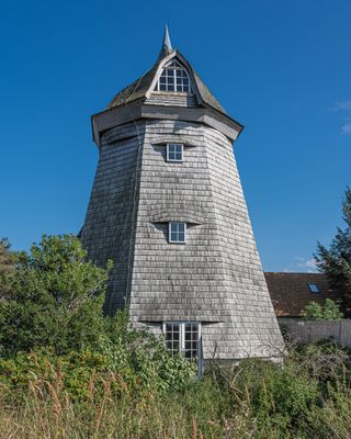 Die sechseckige Holzstruktur der Windmühle Vitte weist eine Außenverkleidung aus Holzschindeln und eine mit Zink gekrönte Spitze auf.