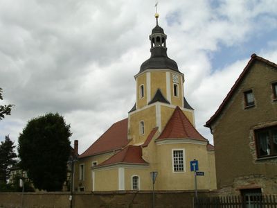 Kirche sowie Kirchhof mit Einfriedung Hauptstraße -, Ein markantes Bauwerk aus mehreren Epochen, im Kern ein romanischer Sakralbau (Chorturmkirche), barock überformt, baugeschichtlich und ortsgeschichtlich von Bedeutung. Eine einschiffige Halle mit Chorturm und romanischem 5/8-Chorschluß, mit barocke