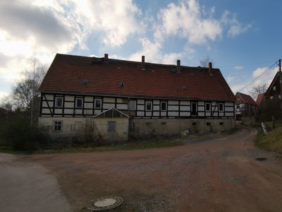 Wohnstallhaus eines Vierseithofes Am Anger 2, markanter Fachwerkbau, Zeugnis ländlicher Architektur und Volksbauweise um 1800, Teil des malerischen Ortskerns von Starbach, baugeschichtlich bedeutend. Fachwerk massiv untersetzt.