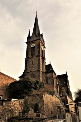 Die Kirche steht auf ehemaligem Weinbergsgelände, da der begrenzte Platz in Lorchhausen die Wahl des Pforten-Standorts erforderlich machte.