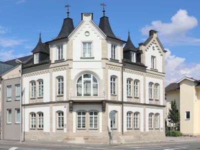 Baudenkmal D-4-63-000-96 in Coburg im Ortsteil Coburg, Wohnhaus, zweigeschossiges, traufständiges Satteldacheckgebäude mit Gauben, Flankentürmen beidseits eines Eckzwerchhauses über einem Kastenerker, neogotisch, von Paul Gerlicher, 1861, aufgestockt von Georg Meyer, 1896.